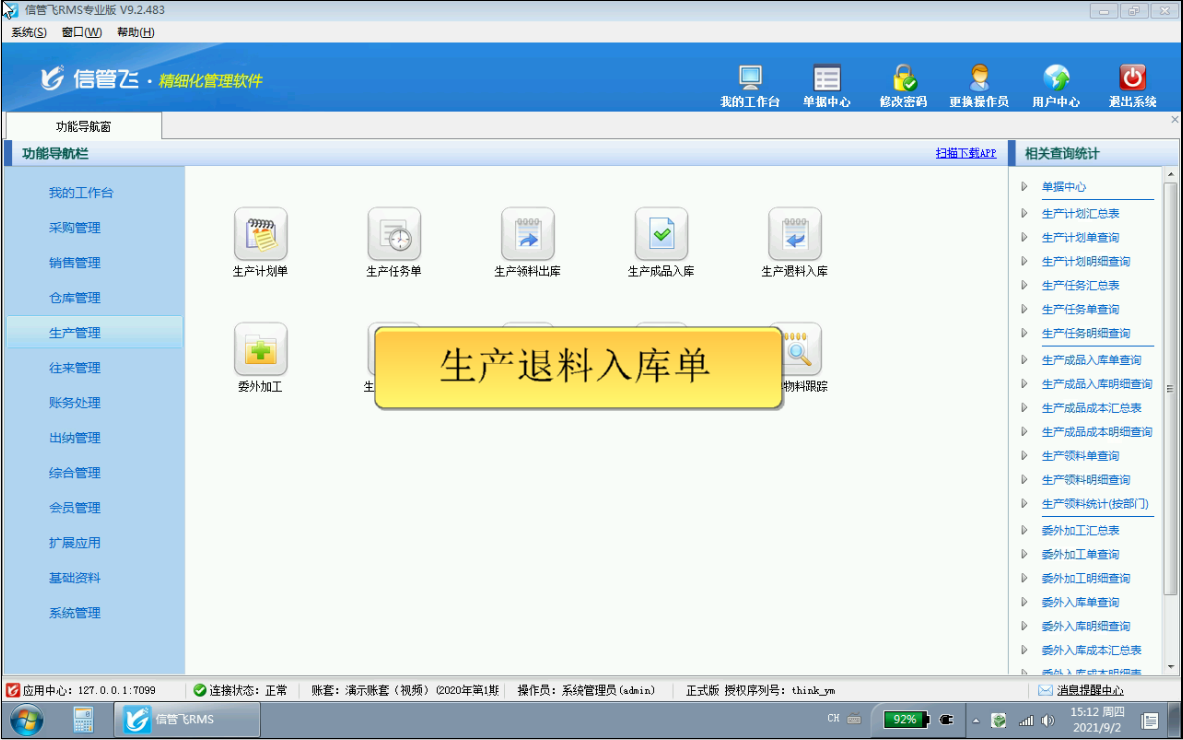 介紹信管飛RMS生產(chǎn)退料入庫單的主要功能和操作步驟。