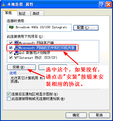 (3)檢查“本地連接”中是否啟用了“Microsoft 網絡的文件和打印機共享”,如果沒有這一項,請安裝相應的協議。