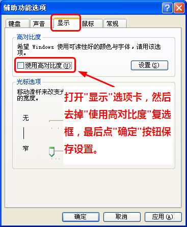 在“輔助功能選項(xiàng)”中,點(diǎn)“顯示”選項(xiàng)卡,去掉其中的“使用高對(duì)比度”復(fù)選框,最后點(diǎn)”確定“按鈕保存設(shè)置。重啟電腦,即可解決問題。