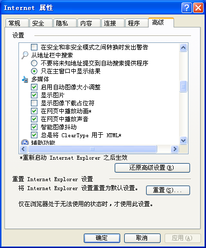 (1)設(shè)置在IE選型的高級(jí)標(biāo)簽頁,復(fù)選 顯示圖片,然后重啟瀏覽器。具體操作如下圖所示:
