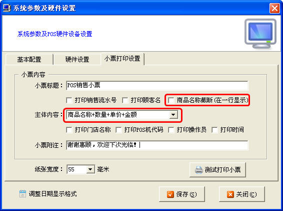 其中,是否打印銷售流水號、是否打印顧客名、是否打印門店名稱、POS機代碼、操作員、時間都可以進行設置,打勾則系統會打印,不打勾則系統不打印。另外,系統也允許設置小票標題和附注,具體對應小票大哪個位置,請參見下圖。