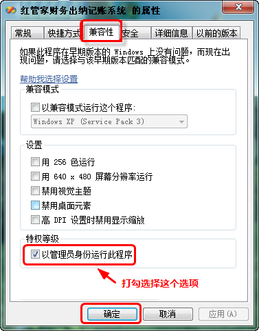 (2)系統會彈出屬性窗口,請在“兼容性”標簽頁中選中“以管理員身份運行此程序”復選框,然后點擊“確定”按鈕。