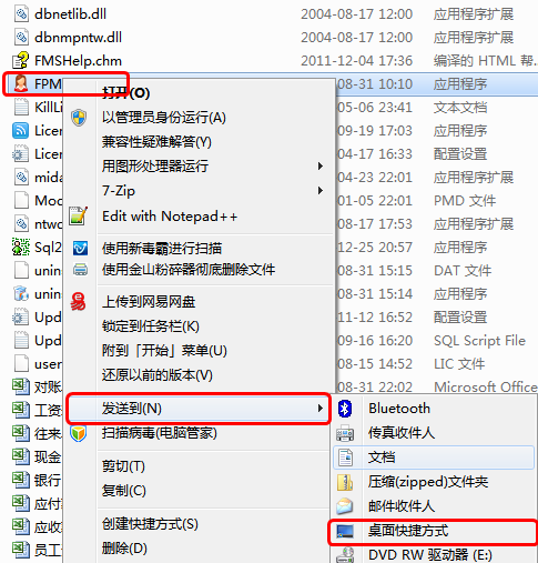 2、重新建立快捷方式,在修改后目錄下的FPMS.exe文件上,點鼠標右鍵,再點“發送到”-》“桌面快捷方式”,發送快捷方式到桌面。默認快捷方式為“FPMS.exe - 快捷方式”,可以將快捷方式名改為“紅管家財務出納記賬系統”。桌面上原來的快捷方式是指向修改前目錄的,可以刪除掉。