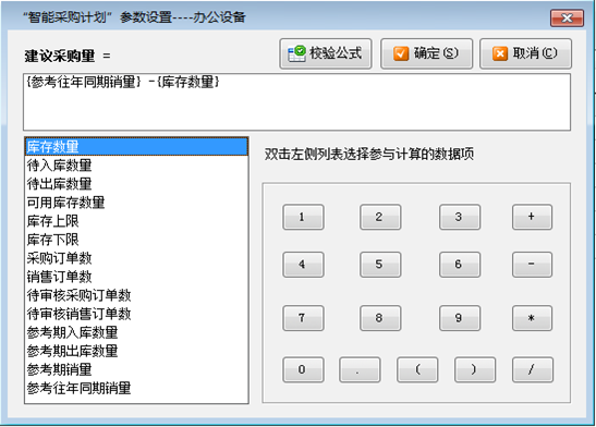 (1)參數設置:可以設置“建議采購量”的運算公式,軟件將根據您設計的公式計算出建議數量,如下圖2所示。
