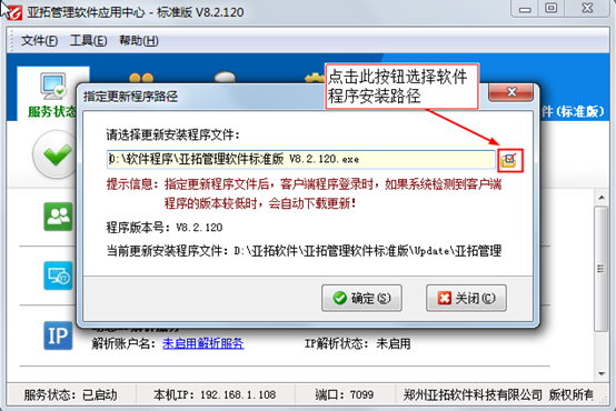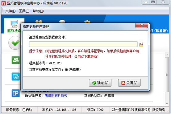 亞拓管理軟件專業版、標準版、星光版都支持網絡版(即可以多臺機器同時使用,數據共享,數據集中存儲在一臺機器上)。為了更好為客戶提供精細化的管理軟件,我們會不定期的升級軟件程序,網絡版多臺電腦使用的時候,每次更新程序需要每臺電腦都下載最新版安裝程序進行安裝,非常麻煩。亞拓管理軟件支持在應用中心設置指定更新程序路徑,客戶端程序在登錄的時候,如果檢測到版本號與應用中心的版本號不一致,則會自動下載更新。下面我們以亞拓管理軟件標準版為例來介紹一下具體的操作步驟。