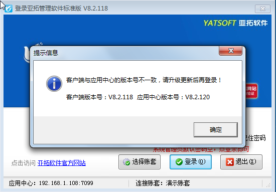 (3)客戶端電腦登陸時會提示“客戶端與應用中心的版本號不一致,請升級更新后再登錄!”,我們點擊“確定”,其操作界面如下圖3所示。