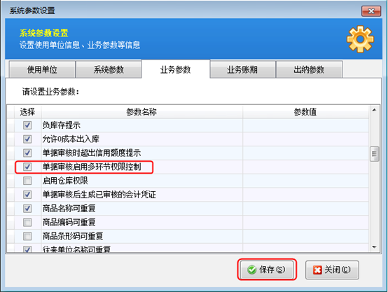 登錄亞拓管理軟件或者亞拓倉庫管理軟件,在功能導航窗點“系統管理”—》“系統參數配置”—》“業務參數”,勾選“單據審核啟用多環節權限控制”,點擊“保存”按鈕,如圖1所示。