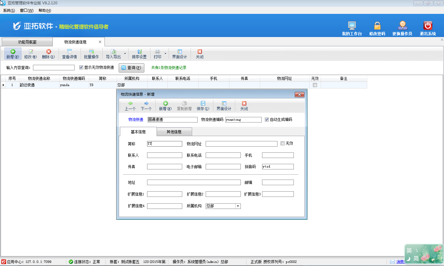 打開亞拓管理軟件,點(diǎn)“基礎(chǔ)資料”——》“物流快遞”窗口,新增物流快遞信息。如下圖一所示。