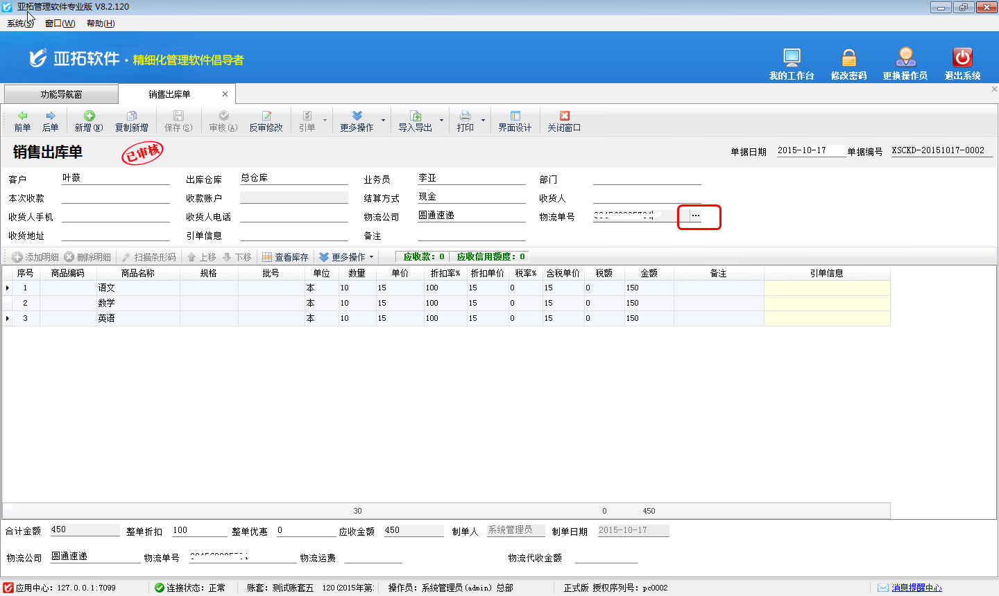亞拓軟件開發(fā)的新架構(gòu)進(jìn)銷存軟件——亞拓管理軟件具有跟蹤查詢物流信息的功能,自亞拓管理軟件V8.2.117版本起,銷售訂單、銷售出庫(kù)單中的物流單號(hào)輸入框增加右邊銨鈕,點(diǎn)擊可直接跟蹤物流單的配送情況。下面我們就詳細(xì)介紹下如何在亞拓管理軟件內(nèi)直接跟蹤貨物的物流信息。