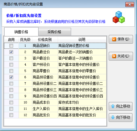(1)對價格優先級進行設置,軟件中可以對銷售價格以及采購價格進行價格優先級設置,可以根據自身業務特點進行啟用不同的價格類型。其中打勾啟用表示生效,點“向上移動”和“向下移動”可以調整價格的優先順序,按上一個價格策略沒有獲取到價格,則自動按下一個價格策略獲取價格。