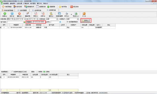 將收款單的單據編號記下之后,可以回到功能導航窗頁面,點擊“業(yè)務處理”—》“收款單列表”,在收款單列表頁面選擇收款日期并輸入我們剛剛記錄的收款單單據編號進行查詢,將我們此前核銷錯誤的那張收款單單據查詢出來,如圖三所示。