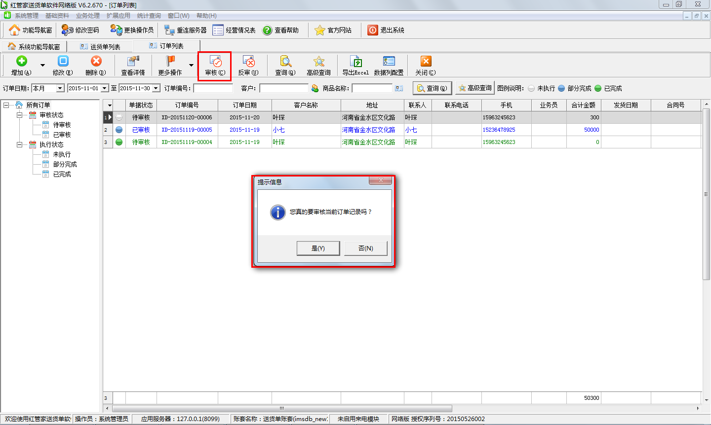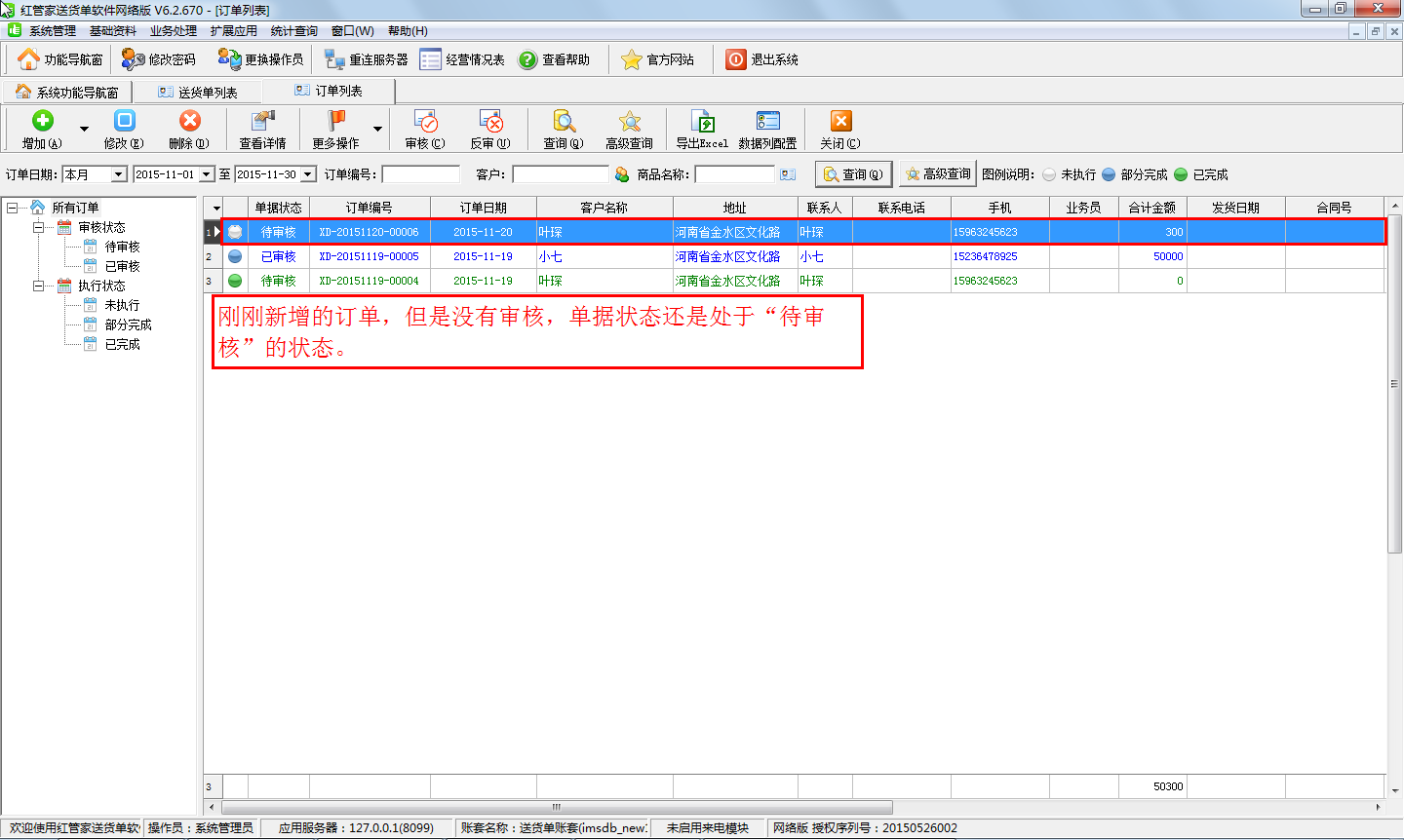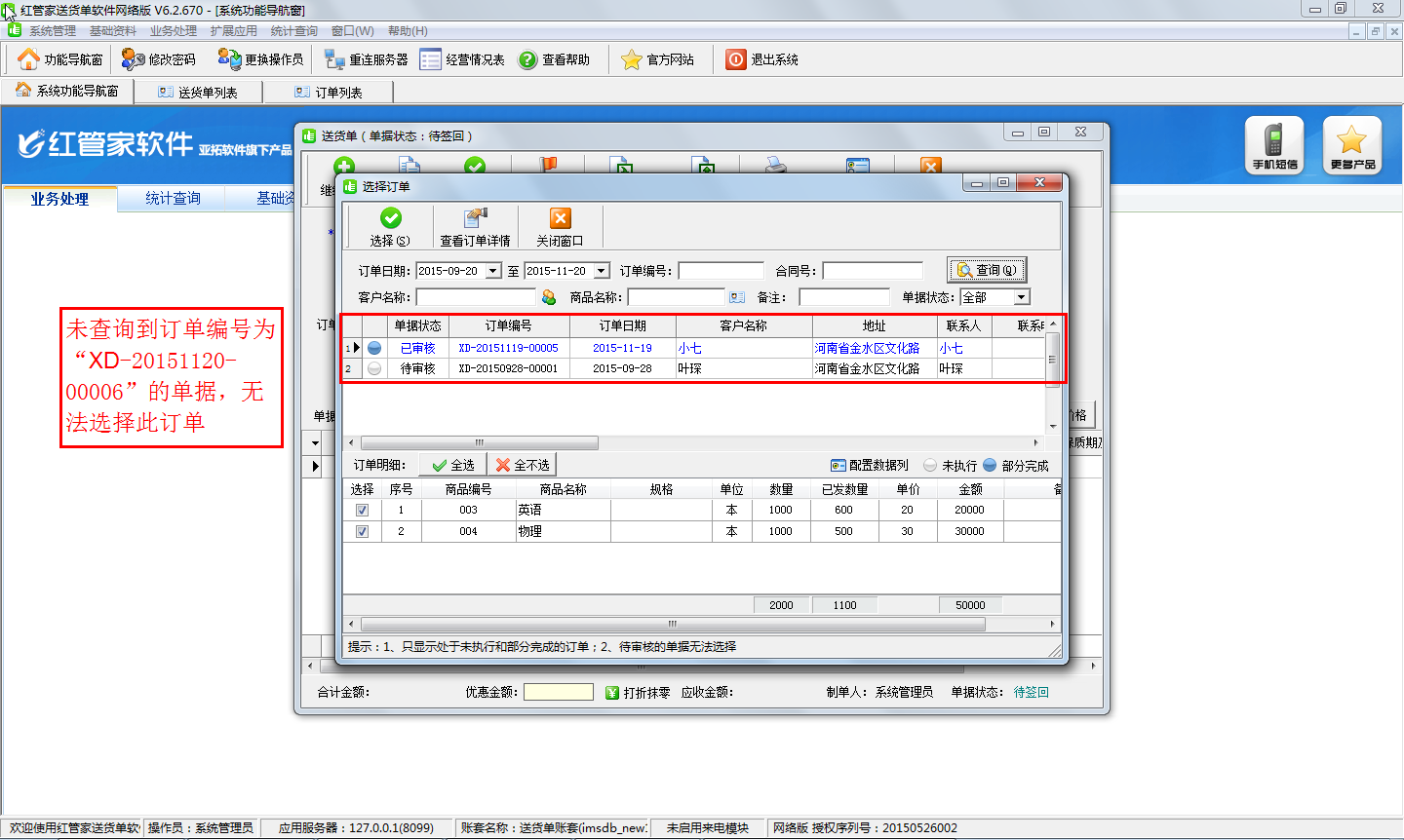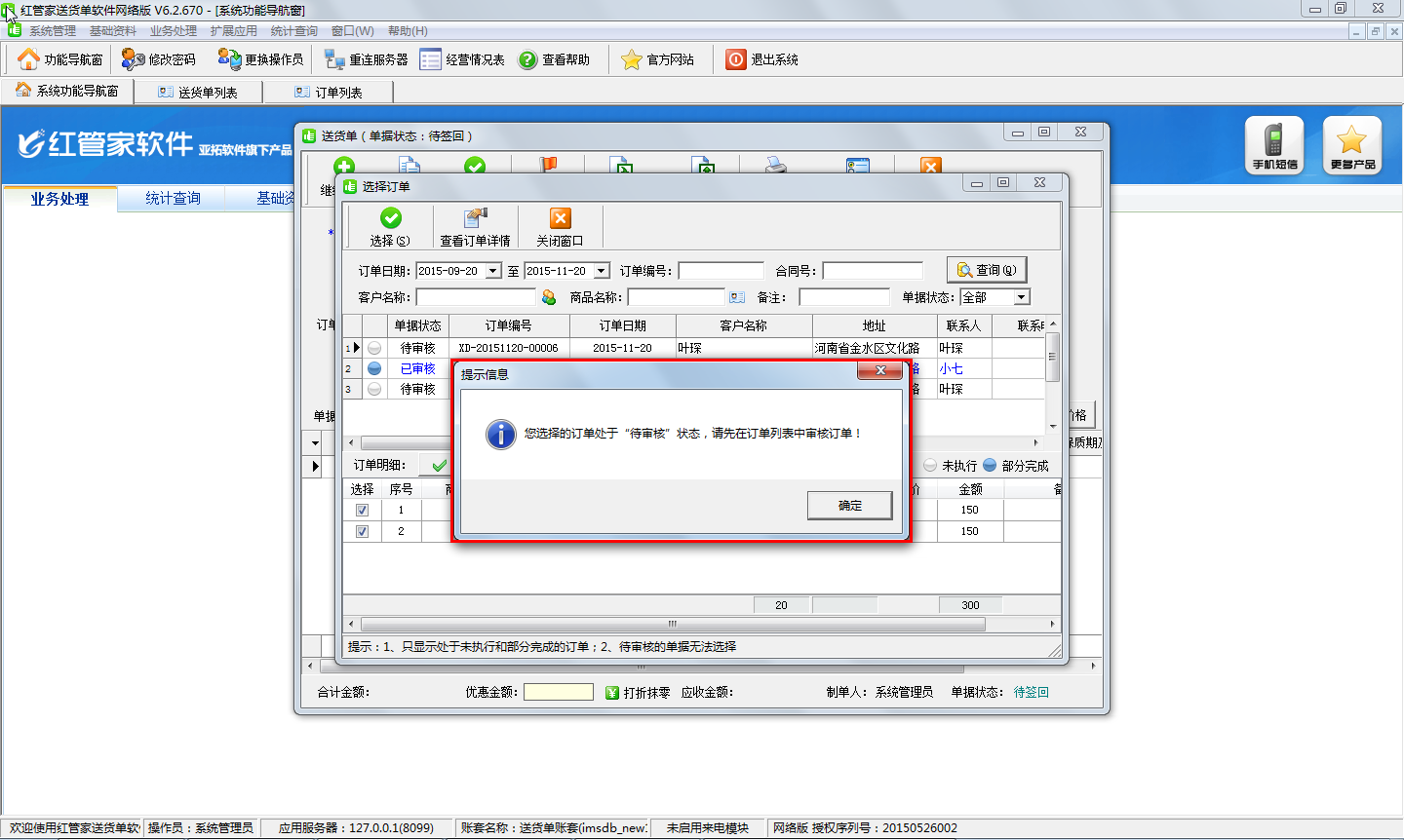 一、新增訂單之后,訂單未審核,還是處于“待審核”的狀態,此種情況下新開送貨單時是無法引用此訂單的,系統會提示“您選擇的訂單處于‘待審核’狀態,請先在訂單列表中審核訂單!”,如下圖所示。