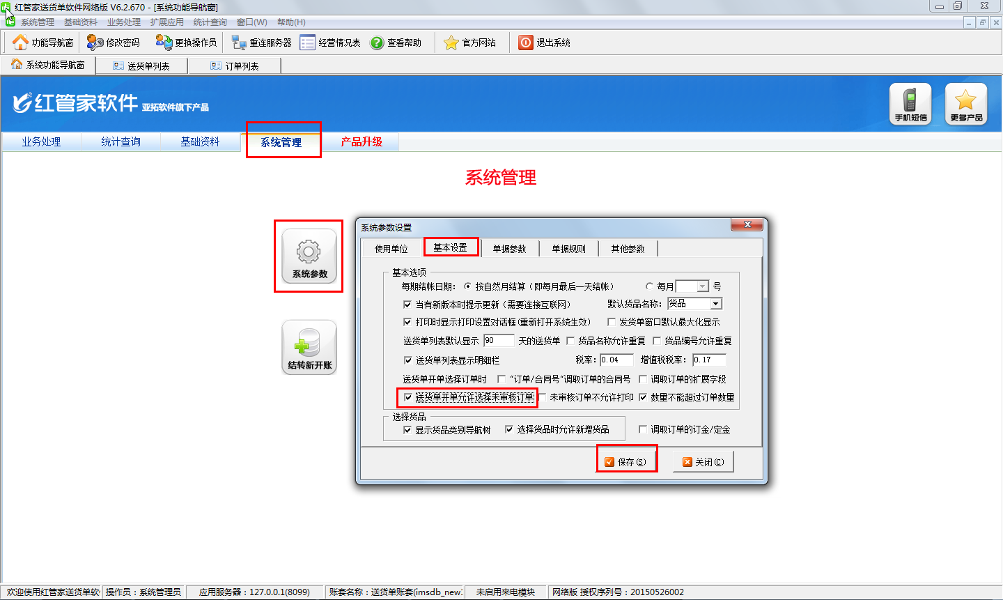 由于系統默認在送貨單開單時是不允許選擇未審核的訂單的,因此訂單審核之后,新開送貨單時再次引用訂單時就可以引用成功了。如果用戶在新開送貨單時想直接引用“待審核”狀態的訂單時,可以在功能導航窗中點擊“系統管理”—》“系統參數”—》“基本設置”中,打勾選中“送貨單開單允許選擇未審核訂單”選項啟用送貨單開單允許選擇未審核訂單的功能,配置完之后點擊“保存”按鈕,之后在新開送貨單時就可以直接引用“待審核”狀態的訂單了,如下圖所示。
