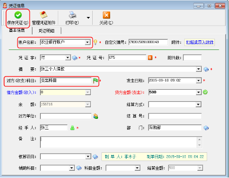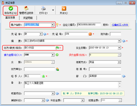 點擊“轉記日記賬”后,可以對還款金額做一個現金日記賬或者銀行日記賬的憑證,填寫好憑證信息后保存憑證即可。