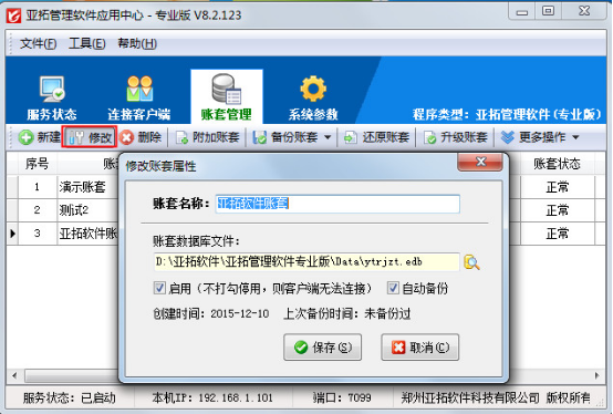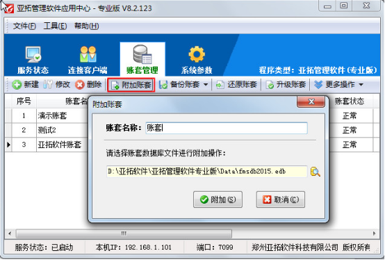 亞拓管理軟件、亞拓倉(cāng)庫(kù)管理軟件中都含有賬套管理功能,賬套管理實(shí)現(xiàn)賬套數(shù)據(jù)庫(kù)的集中管理,包括新建賬套、修改賬套屬性、刪除賬套、附加賬套、備份賬套、還原賬套和升級(jí)賬套等功能。下面我們以亞拓管理軟件為例來(lái)演示一下賬套管理中各個(gè)功能具體的操作方法。