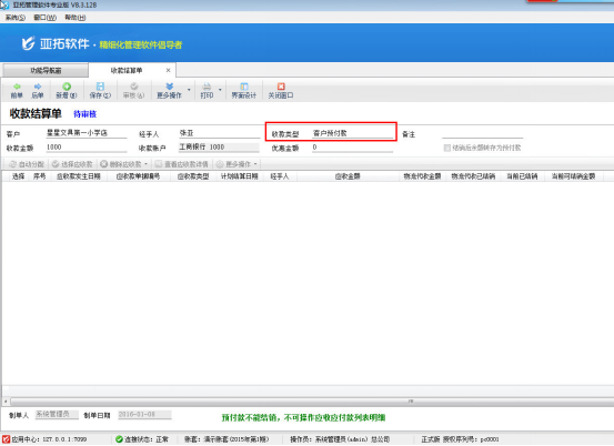 亞拓管理軟件專業版、標準版、星光版都支持錄入客戶預付款,客戶預付款是客戶預付訂金給我們,這種情況下貨物還沒有發出(也就是說沒有開銷售出庫單,一般處于銷售訂單階段),此時我們可以在開銷售訂單的時候直接錄入相應的定金金額。如果還沒有形成相應的銷售訂單,這時我們可以開收款結算單來錄入客戶預付款,下面我們以亞拓管理軟件專業版為例來演示一下具體的操作步驟。
