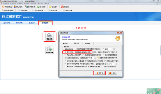打開“系統管理”—“賬套參數”—“賬套參數”,將選項“錄入憑證時,啟用輔助科目(如手續費等)”打勾啟用輔助科目并保存,如下圖所示。