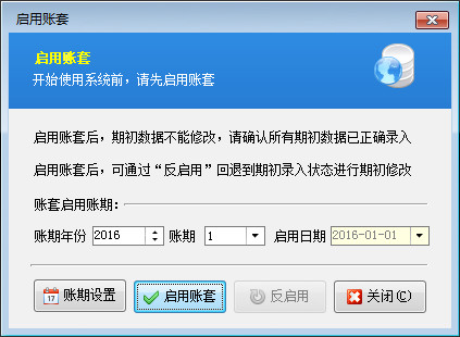 啟用賬期:是指準備從哪個月份開始使用軟件(舉例:假設當前月份為2016年4月份,但我們想從2016年2月份開始使用軟件,可以將啟用賬期設置為2016年、賬期為2,這樣我們需要整理的期初數(shù)據就應該是截止到2016-02-01前的期初應收應付款、期初商品庫存,開賬后就可以錄入2016-02-01之后的業(yè)務單據)。