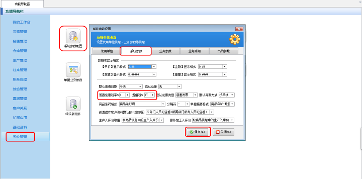 在功能導航窗點擊“系統(tǒng)管理”——“系統(tǒng)參數(shù)配置”——“系統(tǒng)參數(shù)”,在“系統(tǒng)參數(shù)”界面可以設置“普通發(fā)票稅率”及“增值稅發(fā)票稅率”(這里分別設置為4%及17%),設置完之后點擊“保存”按鈕保存配置,如下圖一所示。