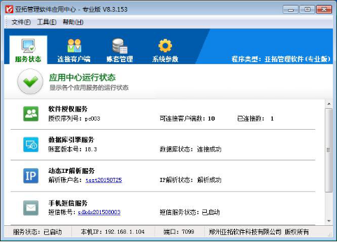 亞拓管理軟件、紅管家倉庫管理軟件和紅管家票據打印軟件都由客戶端程序和應用中心程序兩部分組成,應用中心可以全面掌控軟件的運行情況,可以隨時查看各類服務的運行狀態,主要包括軟件授權服務情況、數據庫引擎服務情況、動態IP解析服務情況、手機短信服務情況等。下面我們以亞拓管理軟件專業版為例介紹一下應用中心的服務狀態。