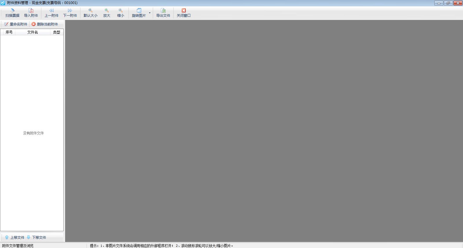 在填開或者修改票據(jù)的界面,如圖1所示,點擊工具欄中的“附件資料”按鈕,可以進入“附件資料管理”界面,如圖2所示,可掃描或?qū)肱c票據(jù)相關(guān)的電子文件。