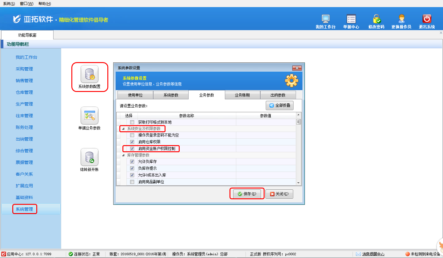 亞拓管理軟件、紅管家送貨單軟件、紅管家財務出納記賬軟件等都可以設置操作員的資金賬戶控制權限,本篇文章以亞拓管理軟件專業版為例介紹一下如何設置操縱員的資金賬戶控制權限,通過“系統管理”——》“系統參數配置”——“業務參數”可以進入“業務參數”配置界面,在系統安全及權限參數內可以啟用“啟用資金賬戶控制權限”參數,如下圖一所示。