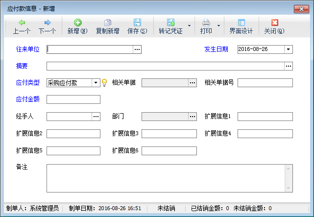 應付類型:應付類型包括采購應付款、采購預付款、采購退貨應退款、期初應付款、其他應付款,應付類型有特殊含義無法維護,如果需要標注其他應付類型可以填寫到擴展信息中。