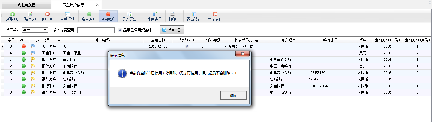 在功能導航窗點擊“基礎資料”——》“資金賬戶”可以進入資金賬戶管理界面,選擇需要停用的資金賬戶,在工具欄點擊“停用賬戶”,系統會提示“當前資金賬戶已停用(停用賬戶無法再使用,相關記錄不會刪除)!”,此時該賬戶即為停用狀態,如下圖中現金賬戶“現金”已停用。