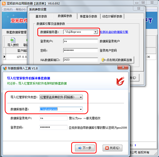 導入紅管家送貨單軟件(網絡版)賬套數據:首先“導入紅管家軟件類型”選擇“紅管家送貨單軟件(網絡版)”,然后選擇數據庫服務器(與老架構應用服務器內“系統參數設置”——》“數據庫參數”內所設置的“數據庫服務器”保持一致,如下圖三所示),然后點擊“下一步”,選擇需要導入的賬套文件點擊“開始導入”即可開始導入網絡版賬套數據。