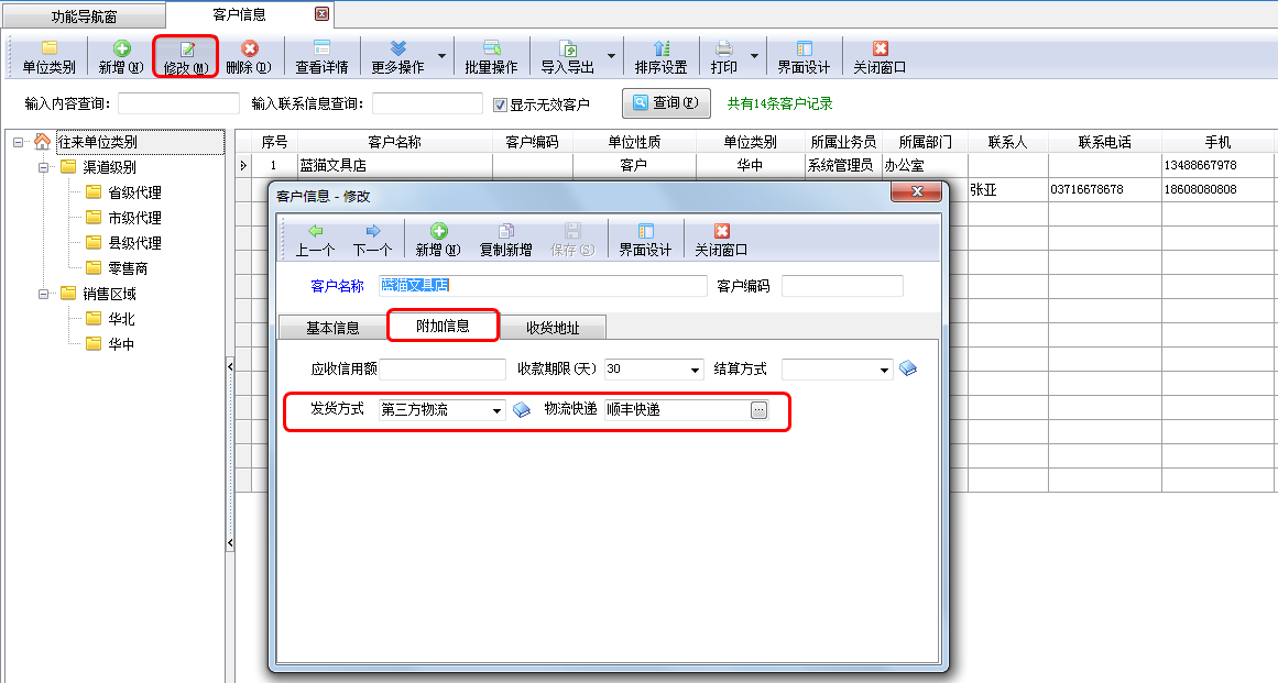 在功能導航窗點擊“基礎資料”—》“客戶信息”打開客戶信息維護界面,選擇其中一個客戶資料進行修改,維護“發貨方式”為“第三方物流”且設置默認物流快遞信息,如下圖一中所示,客戶“藍貓文具店”的默認發貨物流快遞為“順豐快遞”。