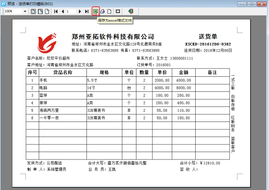 亞拓管理軟件、紅管家倉庫管理軟件、紅管家送貨單軟件、紅管家出納記賬軟件等軟件內都提供的有打印預覽及打印功能,可以打印送貨單、送貨明細對賬單及各類統計報表。多數用戶除了打印送貨單,還會將送貨單或者送貨明細對賬單的打印預覽效果導出為Excel文件直接發給客戶與客戶進行對賬。打印模板的打印預覽圖如何導出為Excel文件呢?下面我們以紅管家送貨單軟件的送貨單模板為例詳細介紹下打印預覽導出為Excel文件的步驟。