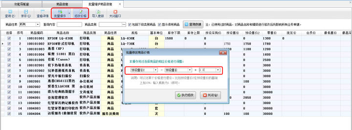 在批量維護商品信息界面工具欄點擊“批量操作”按鈕可以進入批量操作模式,可以復選多個需要調價的商品信息,然后在工具欄點擊“修改價格”按鈕打開“批量修改商品價格”窗口對已選擇的商品信息進行批量調價,比如:預設售價2在預設售價的基礎上提價10%,可以設置為“預設售價2=預設售價*1.1”,如下圖二所示。