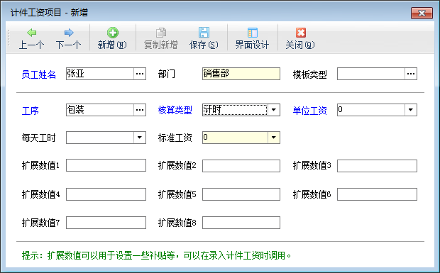 增加項目:點擊工具欄中的“增加項目”按鈕,可以打開“新增計件工資項目”窗口,核算類型分為“計件”或“計時”,用戶根據核算類型維護下每天工時、單位工資等相關數據項后點擊“保存”按鈕即可保存工資模板。