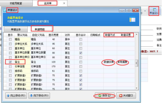 以送貨單軟件為例,示范下如何設(shè)置備注為選擇項(xiàng),首先打開(kāi)一個(gè)送貨單,打開(kāi)工具欄中的“界面設(shè)計(jì)”選擇“單據(jù)明細(xì)”中的備注項(xiàng)。取值方式選擇“數(shù)據(jù)字典”,取值設(shè)置選擇“常用摘要”,然后保存設(shè)置,如下圖所示: