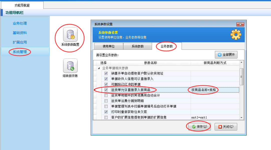 在功能導(dǎo)航窗點(diǎn)擊“系統(tǒng)管理”—》“系統(tǒng)參數(shù)配置”—》“業(yè)務(wù)參數(shù)”即可打開“業(yè)務(wù)參數(shù)設(shè)置”界面,在業(yè)務(wù)單據(jù)相關(guān)參數(shù)內(nèi)打鉤啟用“送貨單允許直接錄入新商品”參數(shù),并設(shè)置新商品判斷方式,默認(rèn)為“按商品名稱+規(guī)格”,如下圖一所示。
