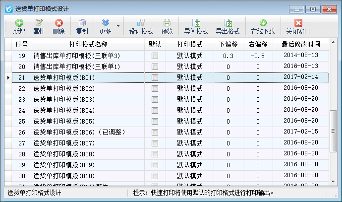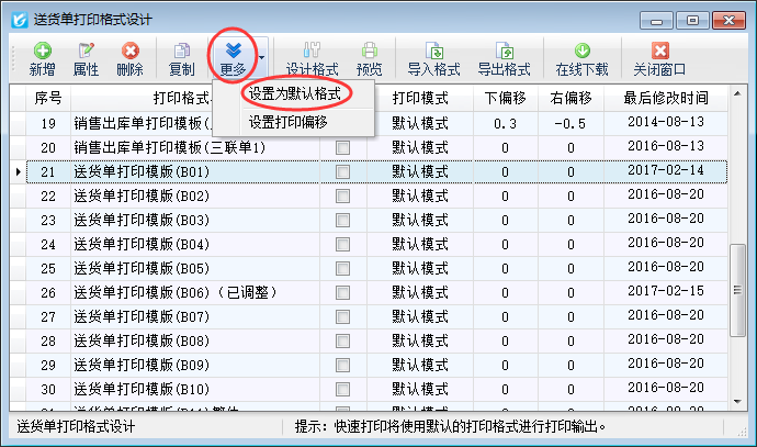 亞拓管理軟件、紅管家倉庫管理軟件、紅管家送貨單軟件、紅管家出納記賬軟件等軟件內都支持自定義打印格式模版,可以更方便、靈活的定制打印輸出內容和格式,有時我們在打印一類單據時可能會用到多個打印格式模版,其中一個打印格式模版為常用的,其他的為不常用的打印樣式,此時我們可以將常用的打印格式模版設置為默認,設置為默認打印格式模版后打印單據時可以使用此默認打印格式模版進行快速打印。