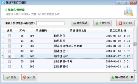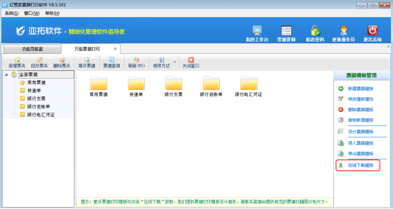 在功能導(dǎo)航窗點(diǎn)“票據(jù)打印”—》“萬(wàn)能票據(jù)打印”,如圖1所示,點(diǎn)擊“在線下載模板”按鈕,系統(tǒng)彈出“在線下載模板”窗口,如圖2所示,選擇需要下載的票據(jù)模板后,可以預(yù)覽樣式并下載。
