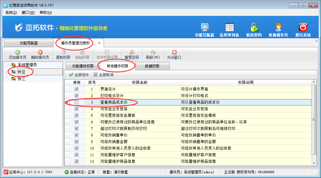 亞拓管理軟件、紅管家倉庫管理軟件及紅管家送貨單軟件內都可以設置多個操作員并對操作員賬號設置權限,部分用戶不希望員工賬號可以查看到商品成本價格,如何設置呢?本篇文章以紅管家送貨單軟件為例詳細介紹一下送貨單軟件內如何設置操作員不可查看商品成本價?