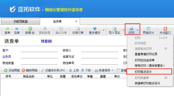 選擇導航欄的“業務處理”模塊,打開一個送貨單界面,選擇界面上的“打印”按鈕下的“打印格式設計”,進入打印格式設計界面,如下圖1 所示: