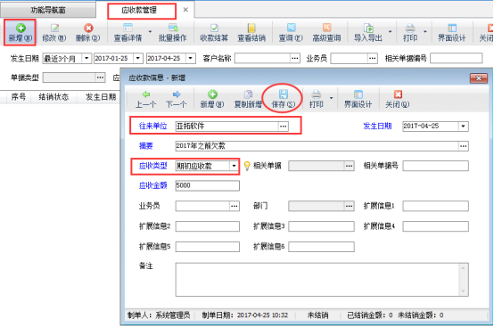 以送貨單軟件為例,示范下如何開客戶的期初應收款?首先在“基礎資料”的客戶信息中先維護好客戶信息,選擇“功能導航窗”的“業務處理模塊”,打開“應收款管理”,點擊界面上的“新增”按鈕,選擇往來單位,應收類型選擇“期初應收款”,輸入摘要和金額點擊保存即可,如下圖1所示: