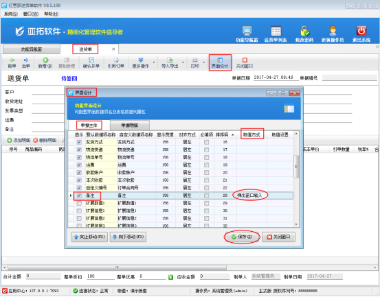 我們以送貨單軟件為例,示范下送貨單軟件開單錄入備注時如何彈出窗口錄入。首先打開一個送貨單,打開工具欄中的“界面設計”選擇“單據主體”中的備注項,取值方式選擇“彈出窗口輸入”,然后保存設置,如圖1所示。