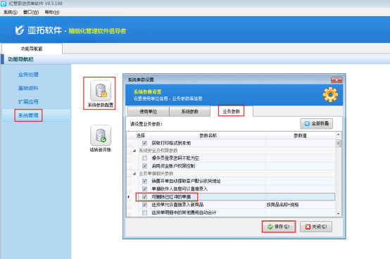 在功能導航窗點“系統管理”—》“系統參數配置”即可進入“系統參數設置”界面,如圖1所示,在業務參數中勾選“可刪除已紅沖的單據”,然后保存。