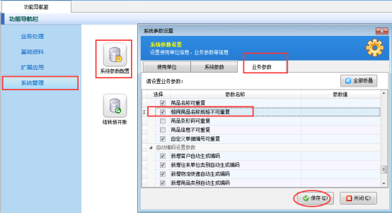 選擇“功能導(dǎo)航窗”的系統(tǒng)管理,選擇“系統(tǒng)參數(shù)配置”打開(kāi),選擇“業(yè)務(wù)參數(shù)”中的“相同商品名稱規(guī)格不可重復(fù)”的參數(shù)進(jìn)行打鉤,保存。如下圖所示: