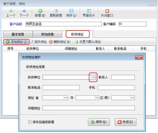 紅管家送貨單軟件、紅管家倉(cāng)庫(kù)管理軟件、亞拓管理軟件開(kāi)單時(shí)都可以錄入多個(gè)收貨地址,以滿足部分客戶有多個(gè)收貨地址的情況。下面我們以紅管家送貨單軟件為例介紹一下錄入多個(gè)收貨地址的具體的操作步驟。