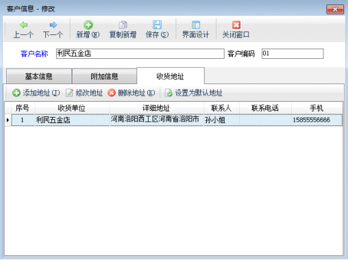 在功能導(dǎo)航窗點(diǎn)“基礎(chǔ)資料”—》“客戶信息”即可進(jìn)入“客戶信息”界面,如圖1所示,點(diǎn)擊“修改”按鈕,打開(kāi)客戶信息修改窗口,基本信息中的“詳細(xì)地址”就是開(kāi)單默認(rèn)地址,點(diǎn)擊“收貨地址”,可以維護(hù)其他的收貨地址信息。