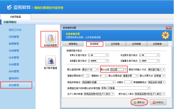 以亞拓管理軟件專業(yè)版本為例,示范下如何設(shè)置默認(rèn)倉(cāng)庫(kù),在功能導(dǎo)航窗選擇“系統(tǒng)管理”—》“系統(tǒng)參數(shù)配置”—》“系統(tǒng)參數(shù)”中設(shè)置默認(rèn)倉(cāng)庫(kù)為“總倉(cāng)庫(kù)”(倉(cāng)庫(kù)信息需提前在基礎(chǔ)資料中添加好)。如下圖所示: