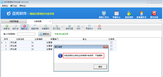 亞拓管理軟件和紅管家倉(cāng)庫(kù)管理軟件都可以對(duì)倉(cāng)庫(kù)信息進(jìn)行管理,如果有些倉(cāng)庫(kù)在單據(jù)中已被使用,系統(tǒng)默認(rèn)在單據(jù)中已使用過(guò)的倉(cāng)庫(kù)信息是不能刪除的(如圖1所示),因?yàn)槿绻麆h除,則會(huì)影響之前已使用此倉(cāng)庫(kù)信息所開(kāi)的業(yè)務(wù)單據(jù),對(duì)于此種情況,我們可以將需要?jiǎng)h除的倉(cāng)庫(kù)置為停用,已停用的倉(cāng)庫(kù)無(wú)法被用于開(kāi)單。如何把不用的倉(cāng)庫(kù)設(shè)置為停用呢?本篇文章以亞拓管理軟件專(zhuān)業(yè)版為例詳細(xì)介紹一下如何把倉(cāng)庫(kù)設(shè)置為停用狀態(tài)。