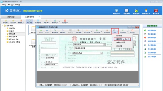 我們以支票打印為例,先填開一個(gè)支票單據(jù),保存支票單據(jù)。然后點(diǎn)擊“打印”—》“直接打印”,如圖1所示。