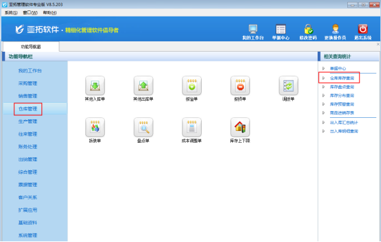 亞拓管理軟件和紅管家倉庫管理軟件都可以對倉庫信息進行管理,都可以查詢商品庫存數(shù)量。倉庫庫存查詢可以查看存貨的實時庫存情況,包括庫存數(shù)量、可用庫存數(shù)量、待入庫數(shù)量、待出庫數(shù)量,并可查看庫存成本情況。支持按照倉庫、商品性質(zhì)等條件進行匯總。本篇文章以亞拓管理軟件專業(yè)版為例詳細介紹一下如何查詢商品庫存數(shù)量。