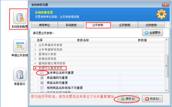 以亞拓管理軟件專業(yè)版為例,在系統(tǒng)管理—》系統(tǒng)參數配置—》業(yè)務參數中的“數據可重復參數”把“往來單位名稱可重復”的勾選符號取消,然后保存設置。如下圖所示: